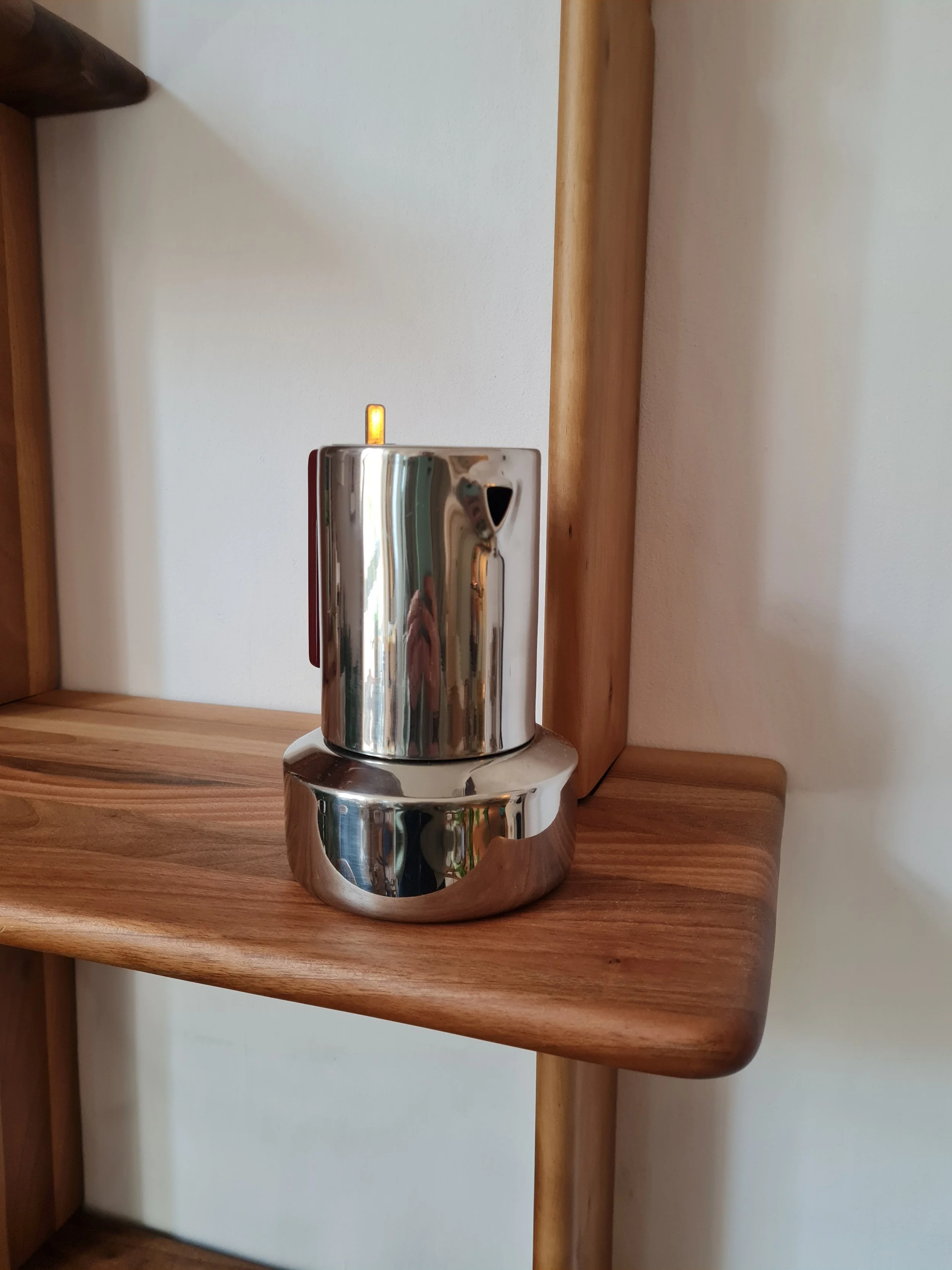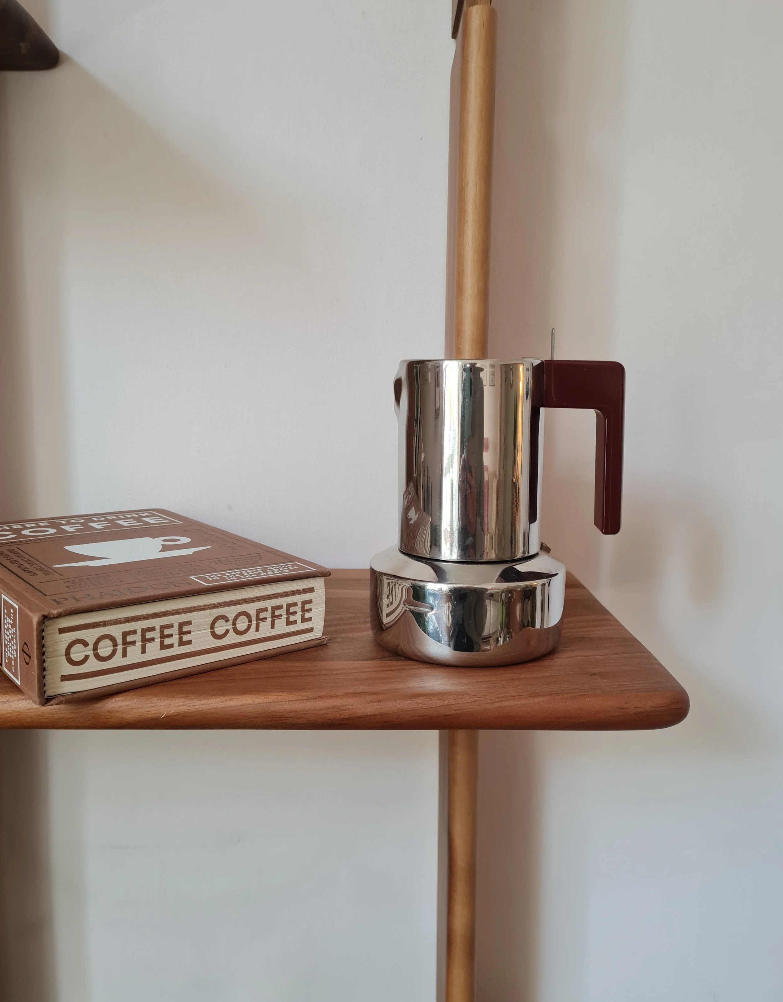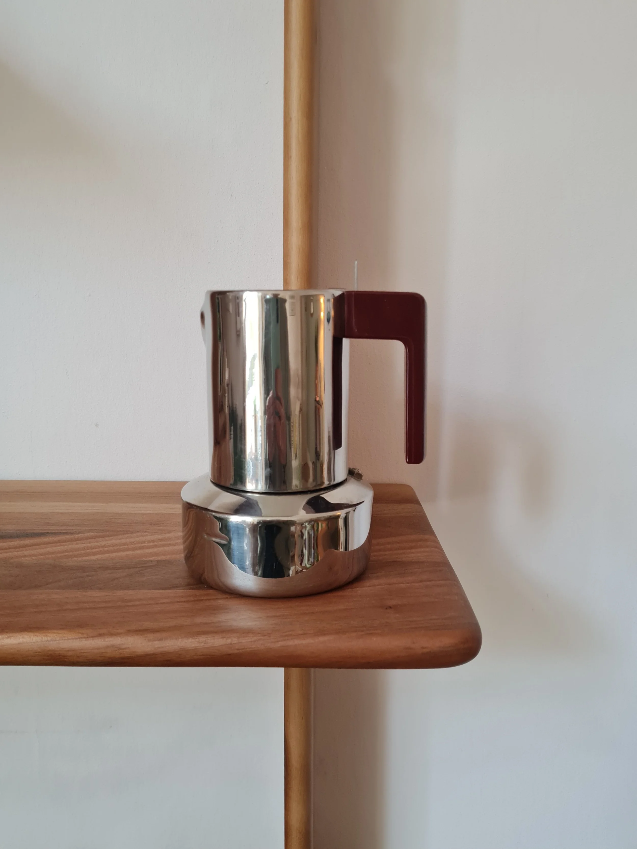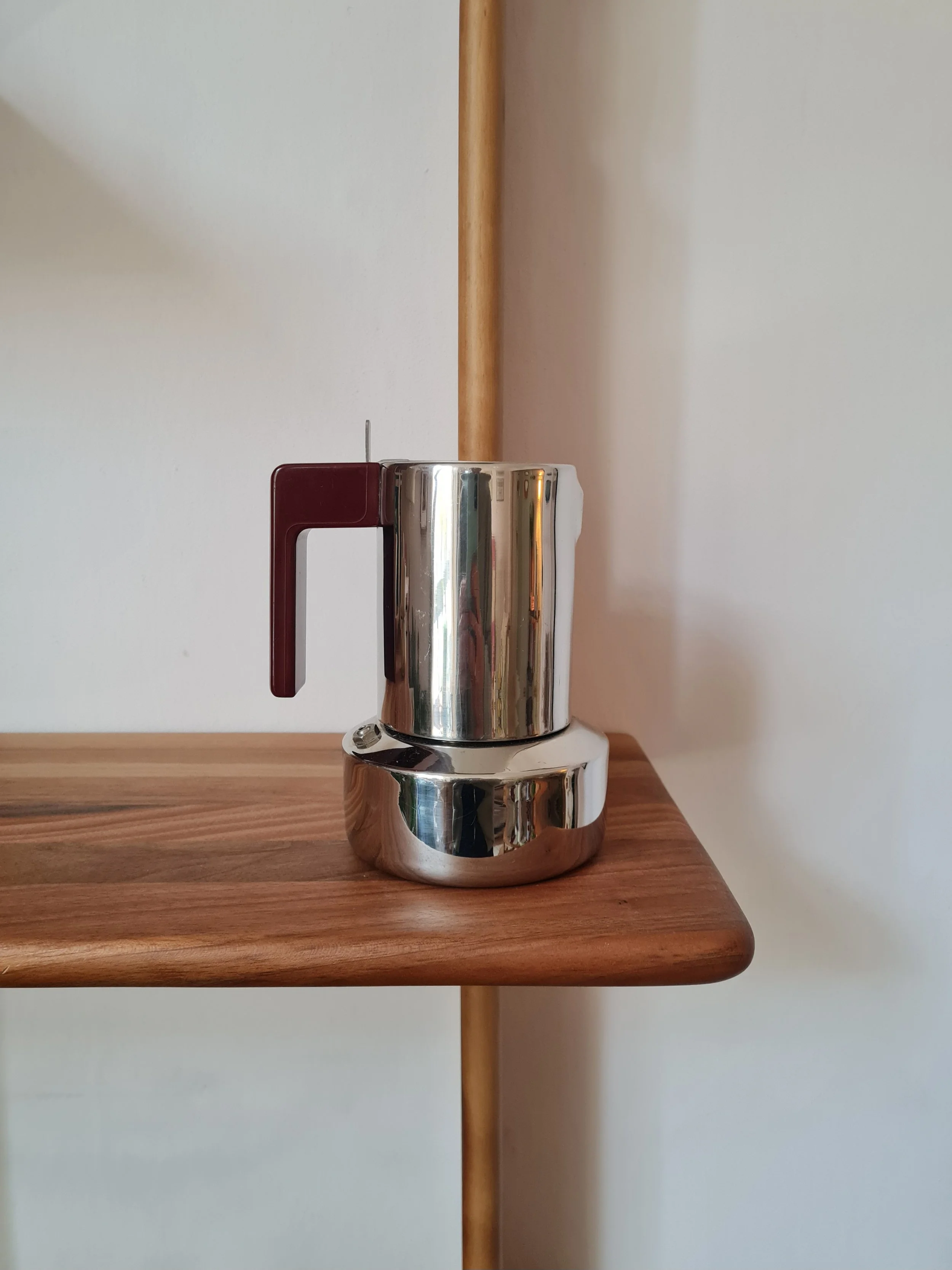 Unique 1980s Inoxpran moka pot in stainless steel with burgundy bakelite handle.